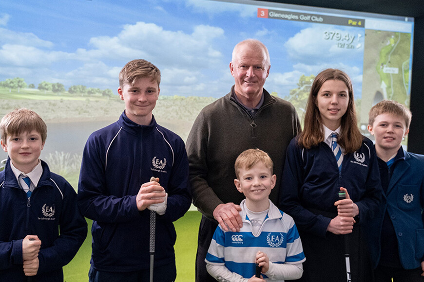 We are pleased to announce the opening of the Henry Marsh Golf Centre, located at the Edinburgh Academy Junior School on Arboretum Road. We are grateful to British Open and Masters winner Sandy Lyle for cutting the ribbon and declaring the facility open! Lucky P4 pupil Angus Dunn hit the first ball, then he and a group of EA pupils received a few pro tips from Sandy.