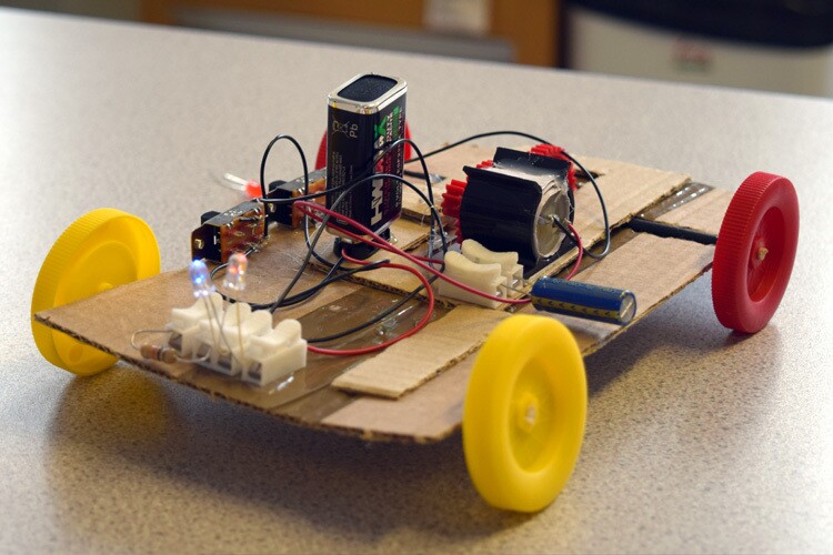 On the fictional island there wasn’t clean water, so we created a filtration device. We were sent kits to work with but the parts are easy to find. Another task was to create a capacitor powered buggy, an electric vehicle powered by a super-capacitor that you can charge up. It is basically a rechargeable, short-term battery and we also included light circuits. The third task was to create a solar panel and wind turbine.