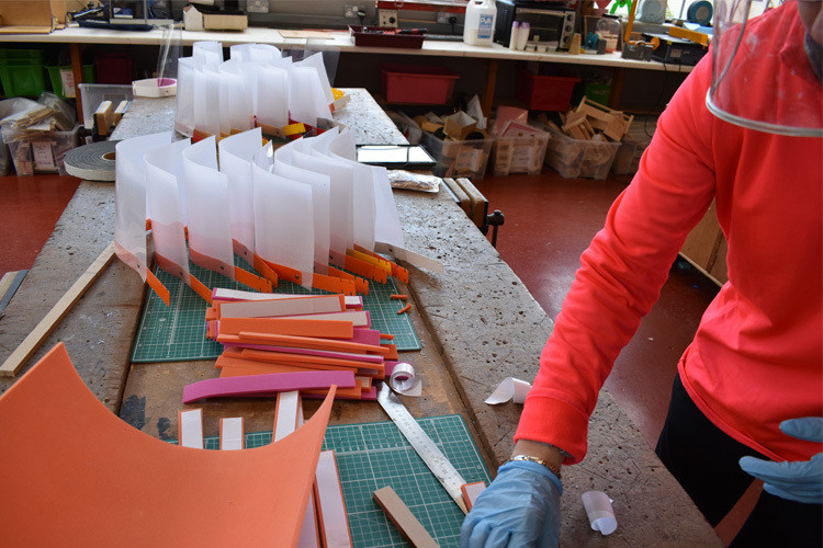 After keyworker pupils go home, three healthy staff members observe social distancing and individually assemble the laser-cut visors while gloved and masked. They produce an average of 40 per day.